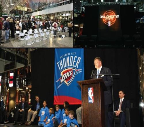 位于俄克拉荷马市中心的领导广场,上方挂着一条横幅,由队员梅森、威尔金斯和六名孩子拉下帷幕,巨大的蓝色横幅中,雷霆Logo位于中间,顶部以黄色为主,底部点缀红橙色。浅蓝色和州际旗帜呼应、黄色代表太阳、红橙色象征日落,橙色的选用则恰到好处,将俄克拉荷马州立大学(橙色)和俄克拉荷马大学球迷(深红色)两派联系在一起。