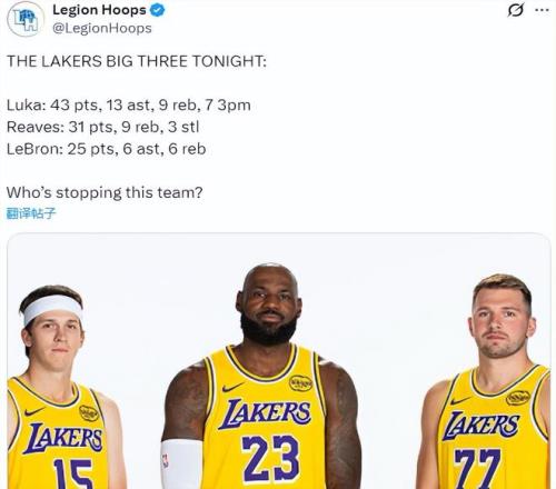 这就是湖人三巨头合体的完美效果,东契奇轰下43分9篮板13助攻,里夫斯得到31分9篮板3助攻3抢断,詹姆斯得到25分6篮板6助攻。三巨头联手贡献99分24篮板22助攻,率领湖人以135比118击败快船,取得五连胜,战绩来到了13胜4负,升回到西部第二,同时从NBA杯西部B组突围,锁定了NBA杯淘汰赛的资格。